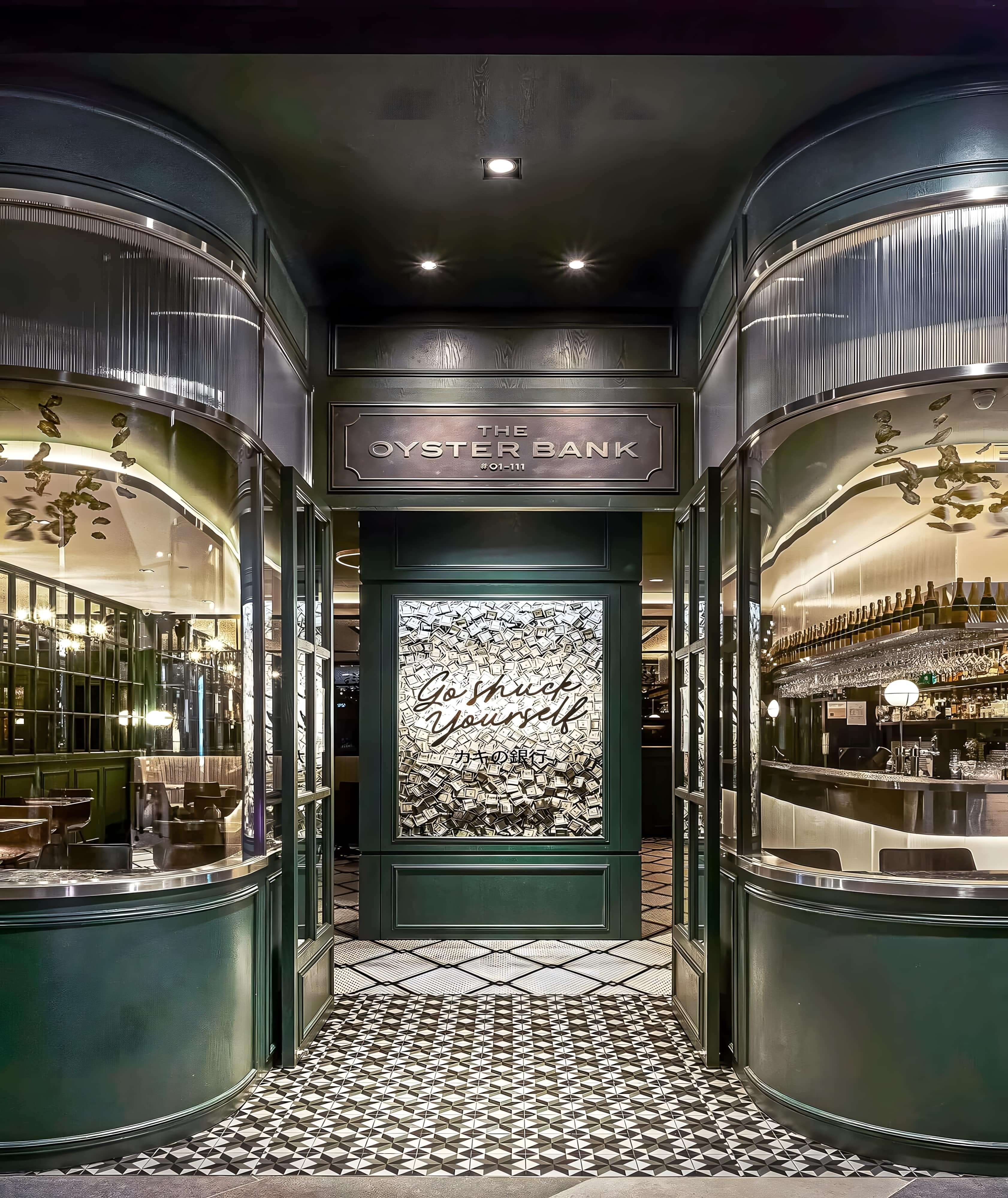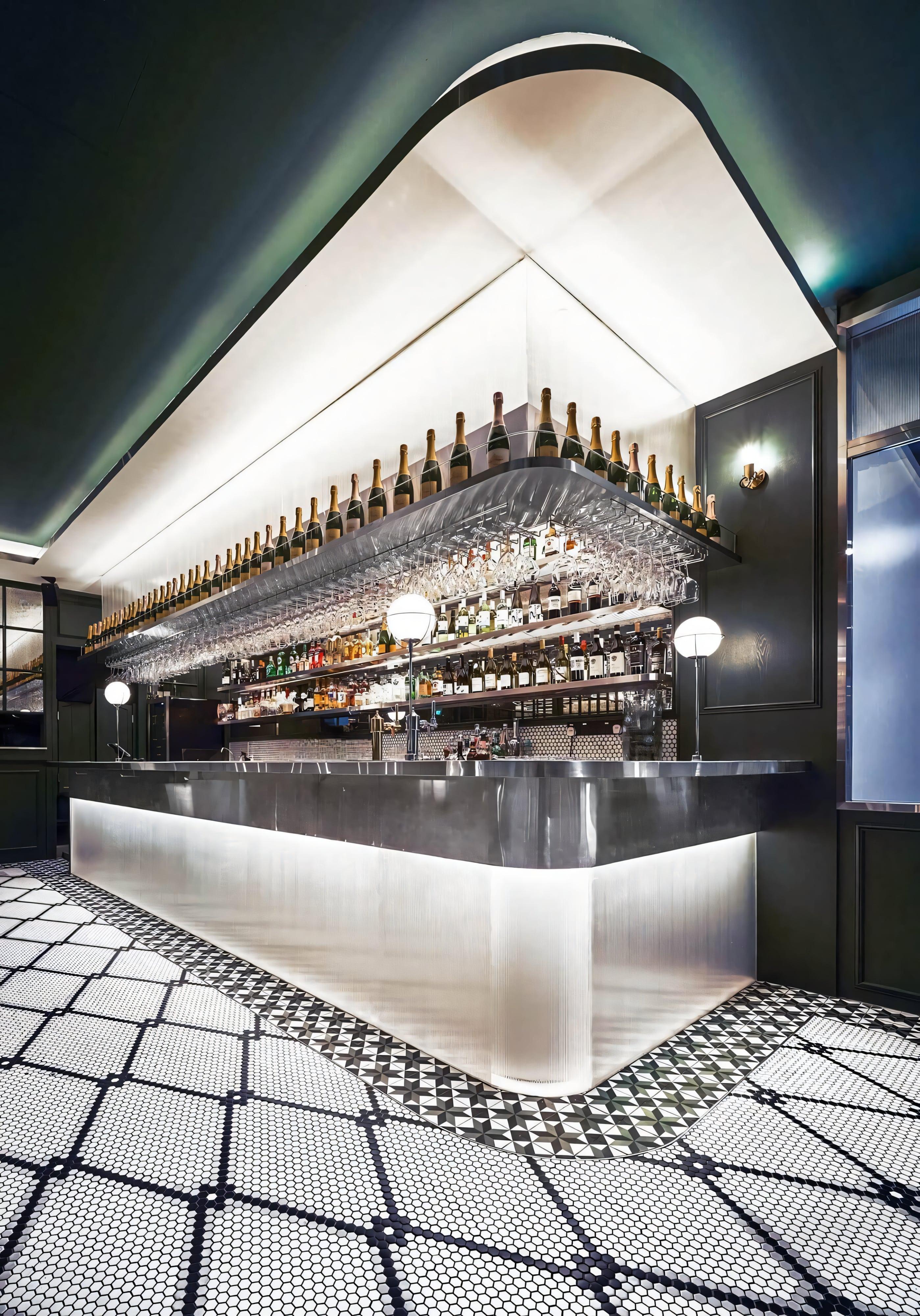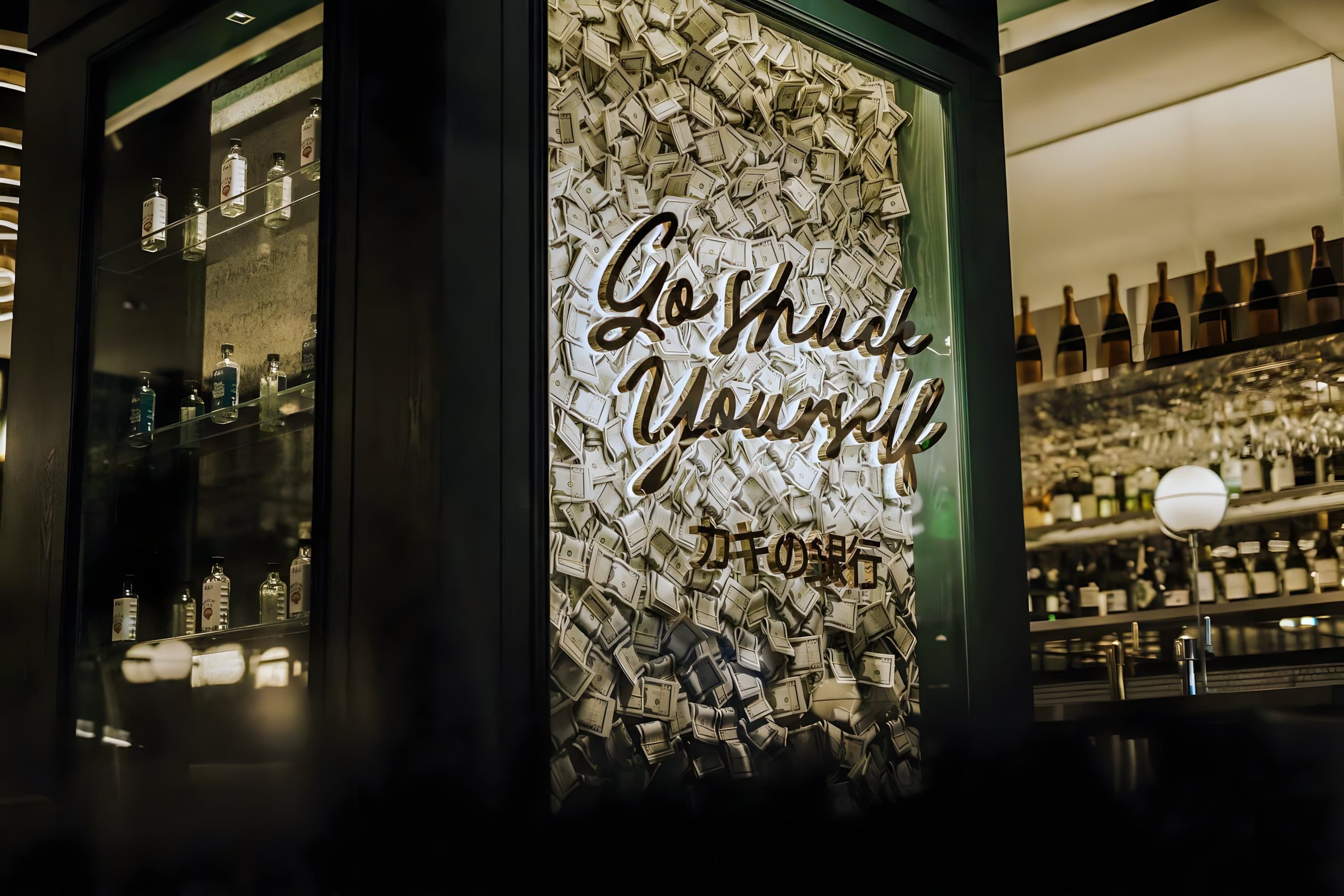 SEAMLESSLY BLENDS 80S BANK NOSTALGIA WITH CONTEMPORARY DESIGN. POLISHED MARBLE, RETRO ELEMENTS, AND ANTIQUE GLASS CREATE AN INVITING AMBIANCE. A GLASS CHAMBER WITH DOLLAR NOTES AND KINETIC ART INSTALLATIONS INFUSE ENERGY, BALANCING PAST AND PRESENT TO ELEVATE THE BAR EXPERIENCE.