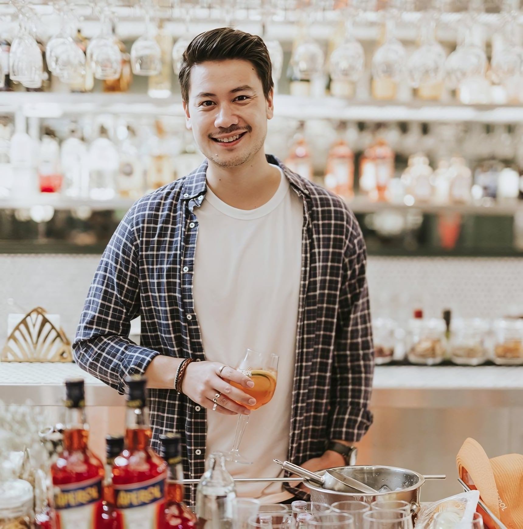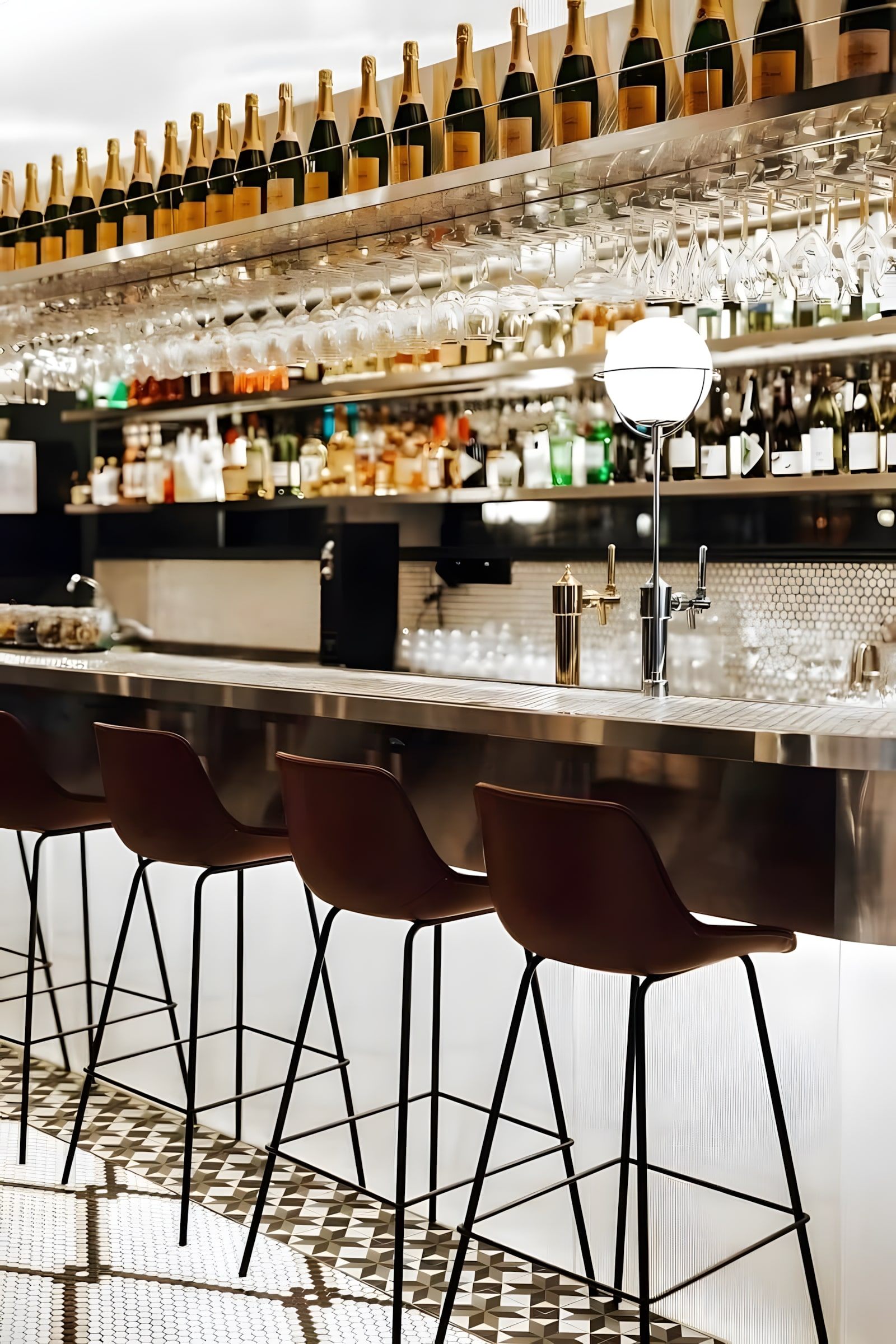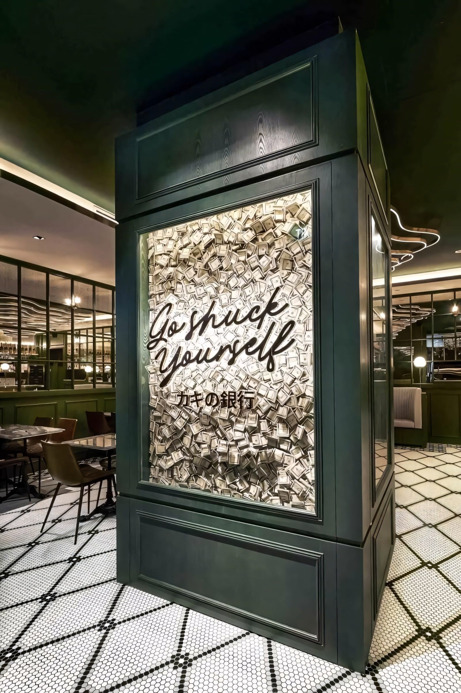 SEAMLESSLY BLENDS 80S BANK NOSTALGIA WITH CONTEMPORARY DESIGN. POLISHED MARBLE, RETRO ELEMENTS, AND ANTIQUE GLASS CREATE AN INVITING AMBIANCE. A GLASS CHAMBER WITH DOLLAR NOTES AND KINETIC ART INSTALLATIONS INFUSE ENERGY, BALANCING PAST AND PRESENT TO ELEVATE THE BAR EXPERIENCE.