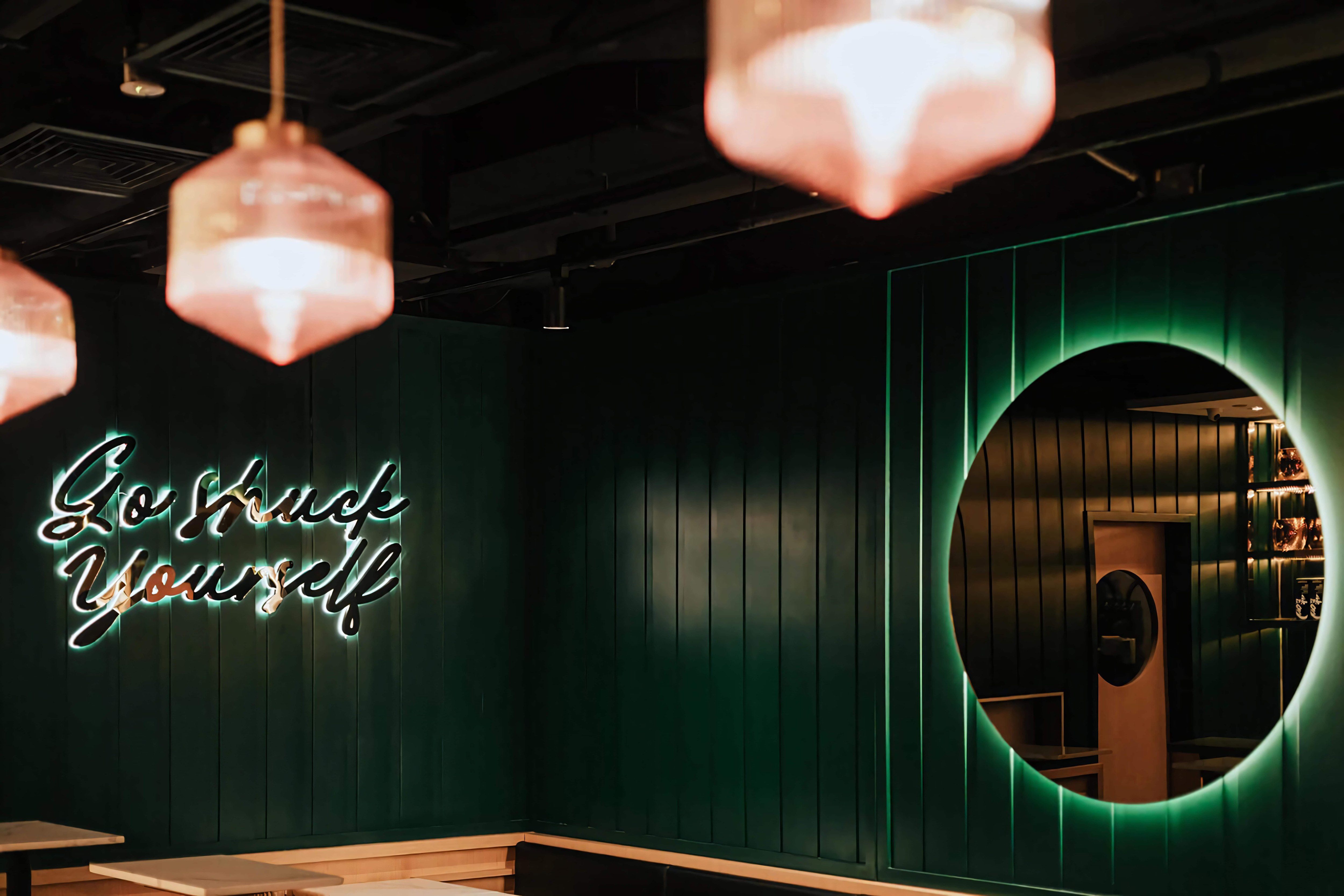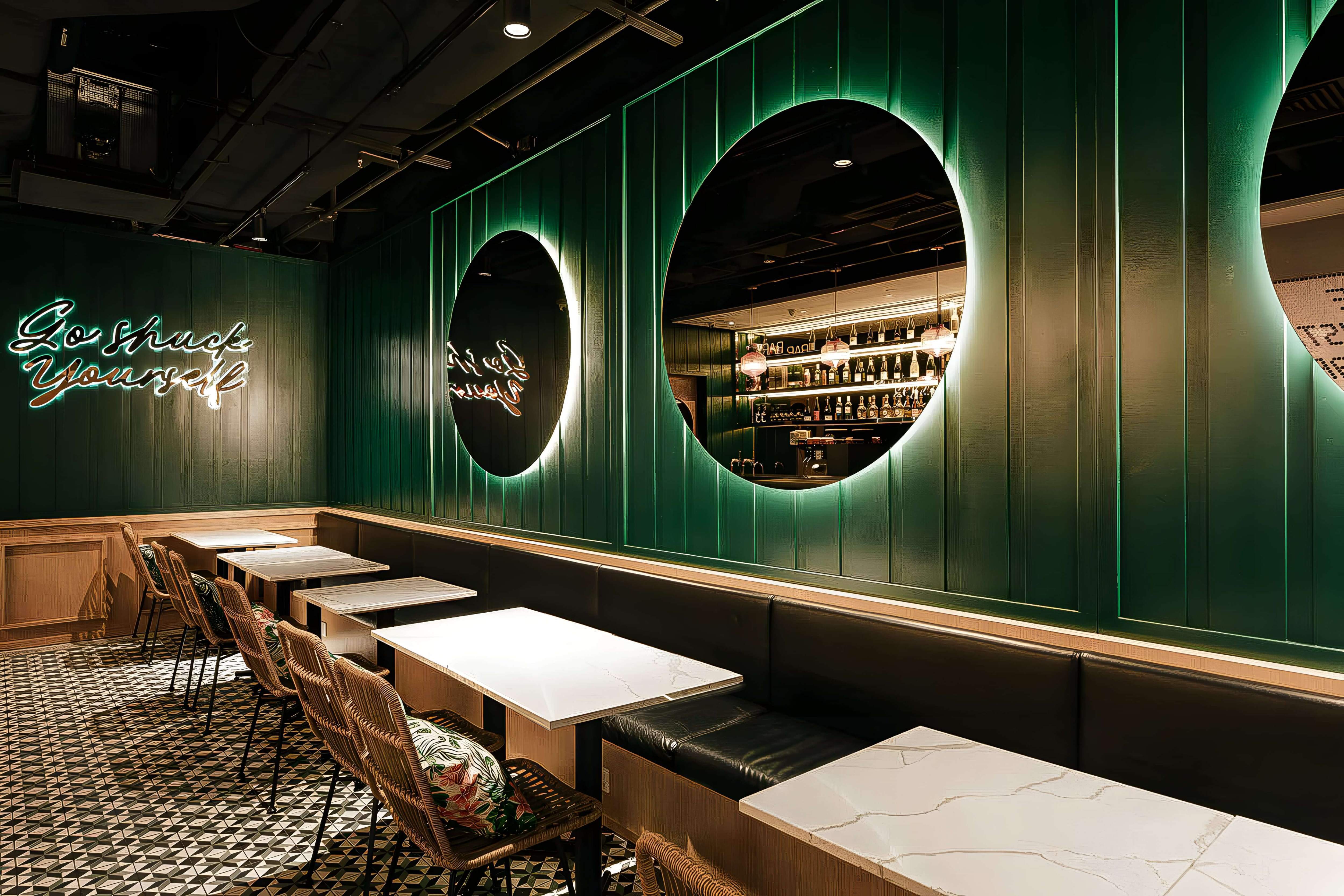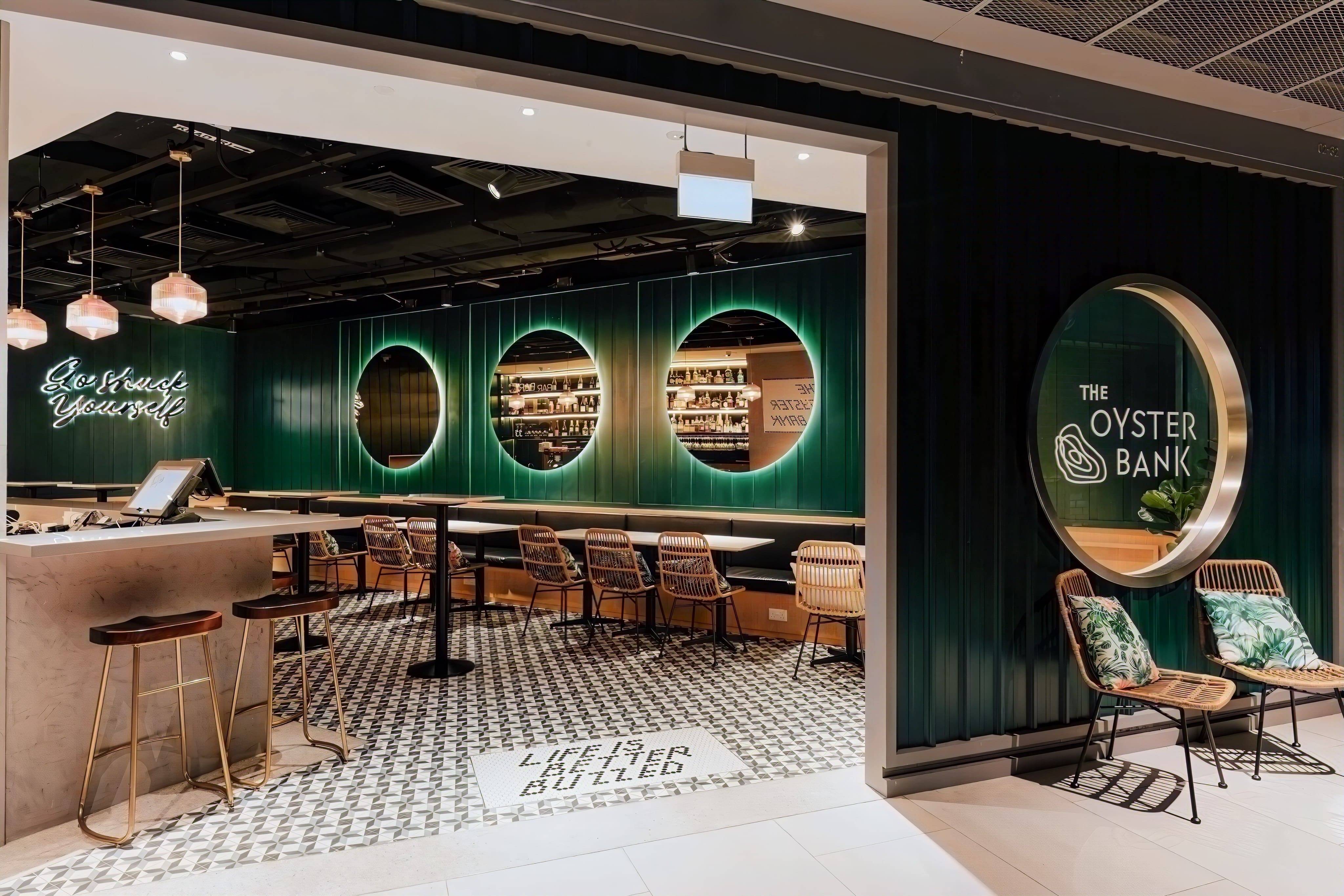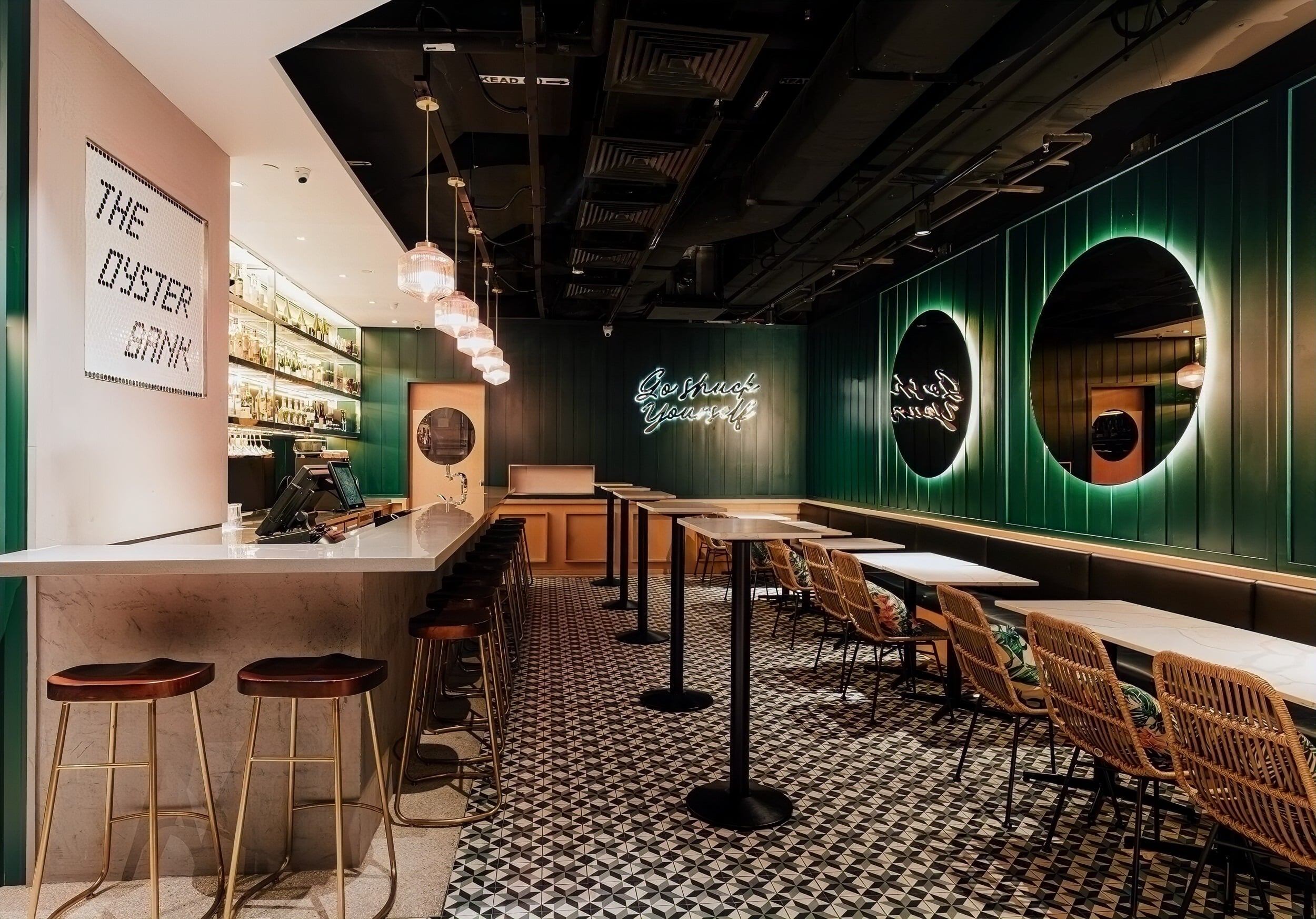 THE OYSTER BANK OPENED AT FUNAN, SINGAPORE, QUICKLY BECOMING A POPULAR DINING SPOT. THE 30-SEATER SPACE, DRESSED IN OYSTER GREEN WITH BRASS AND GOLD ACCENTS, OFFERS A WARM, LUXURIOUS AMBIANCE. BLENDING BAR AND RESTAURANT ELEMENTS WITH A SIT/STAND CONCEPT, IT PROVIDES A RELAXING ESCAPE FROM THE DAILY GRIND.