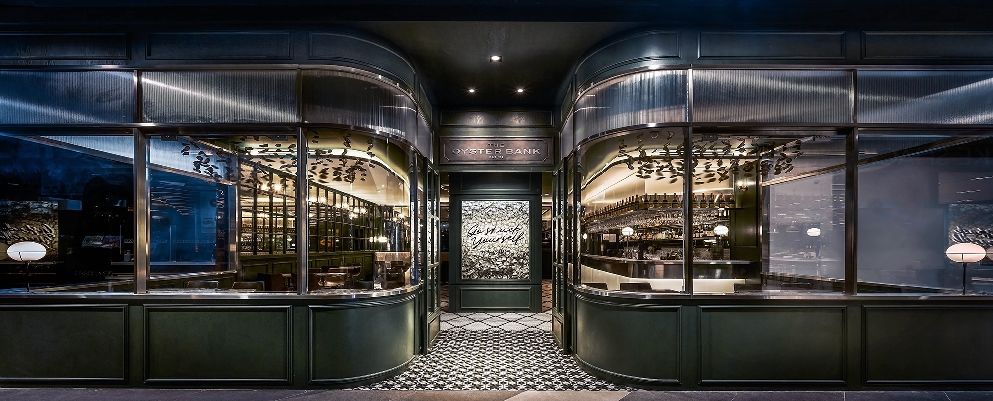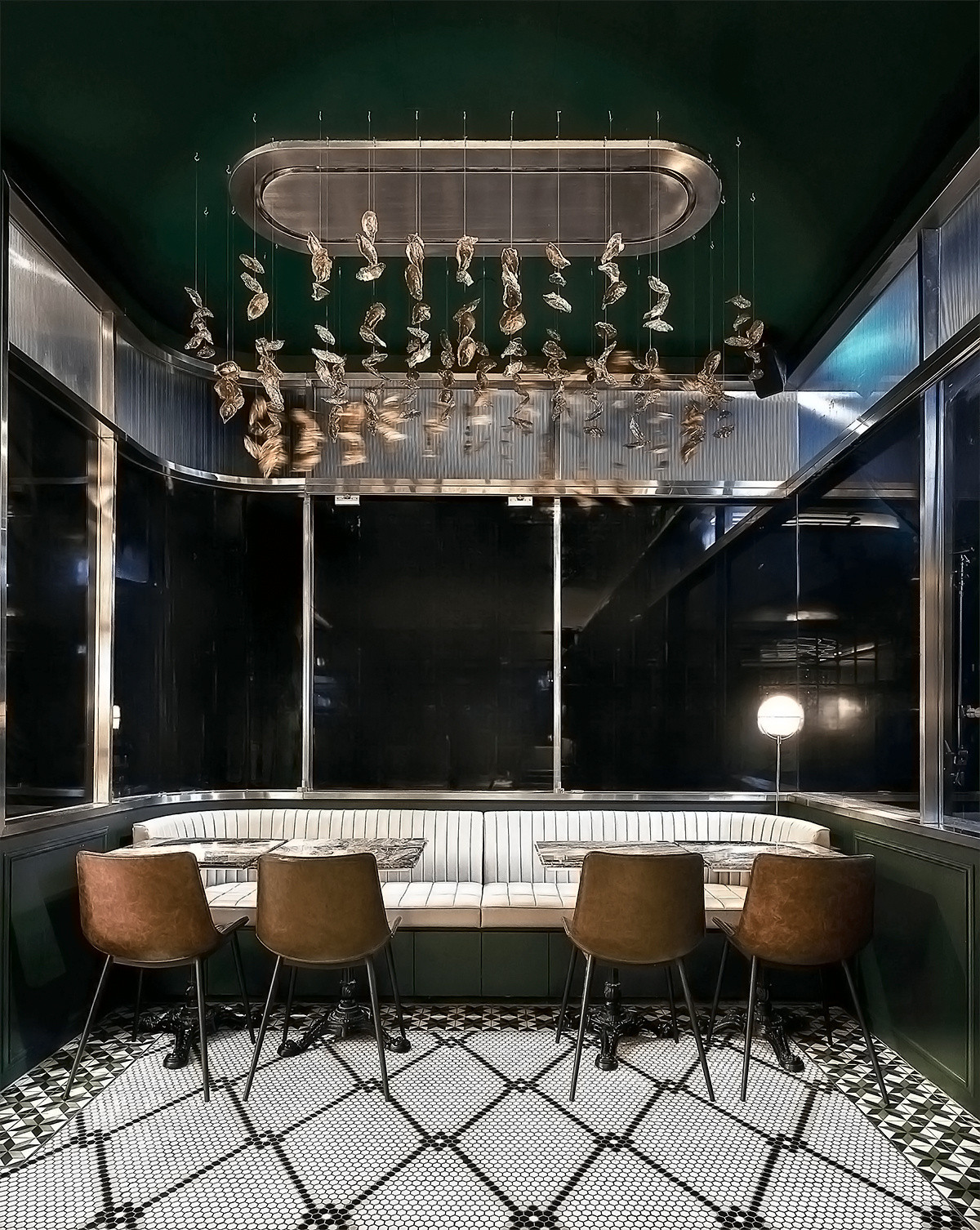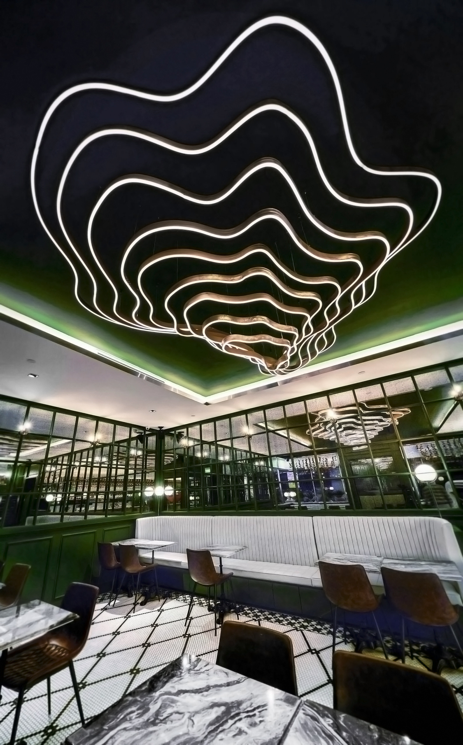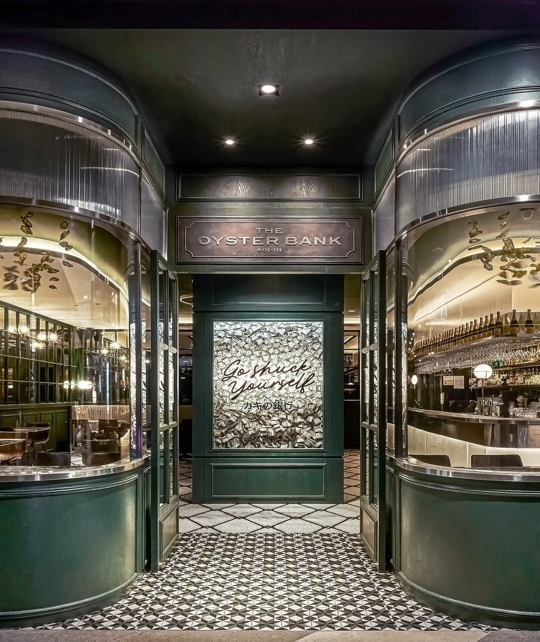 SEAMLESSLY BLENDS 80S BANK NOSTALGIA WITH CONTEMPORARY DESIGN. POLISHED MARBLE, RETRO ELEMENTS, AND ANTIQUE GLASS CREATE AN INVITING AMBIANCE. A GLASS CHAMBER WITH DOLLAR NOTES AND KINETIC ART INSTALLATIONS INFUSE ENERGY, BALANCING PAST AND PRESENT TO ELEVATE THE BAR EXPERIENCE.